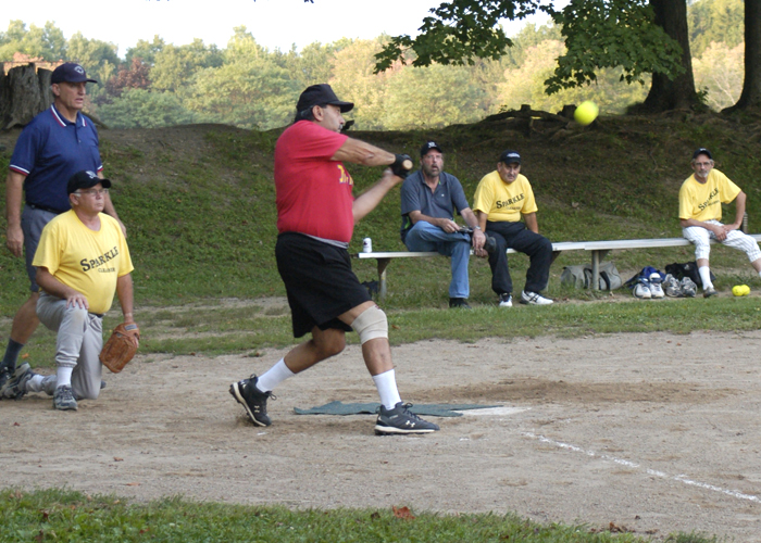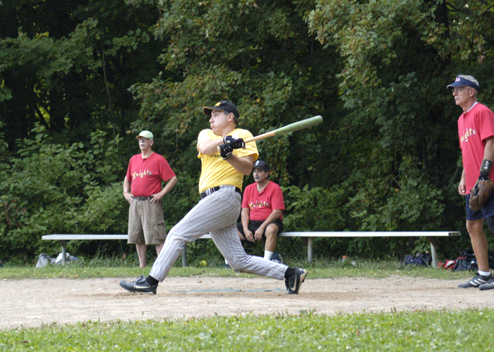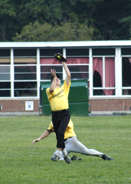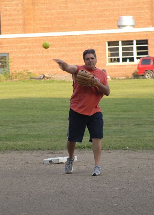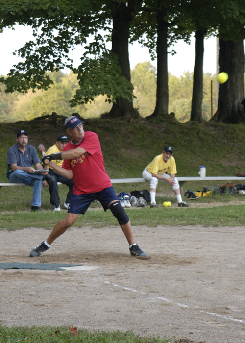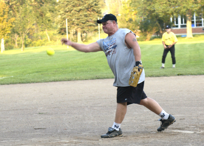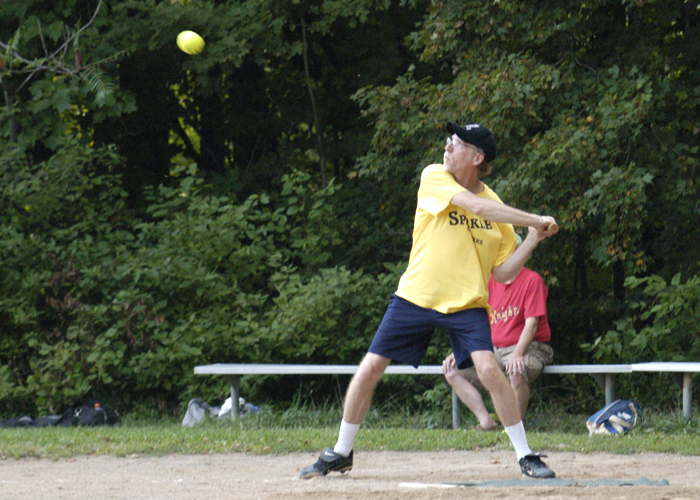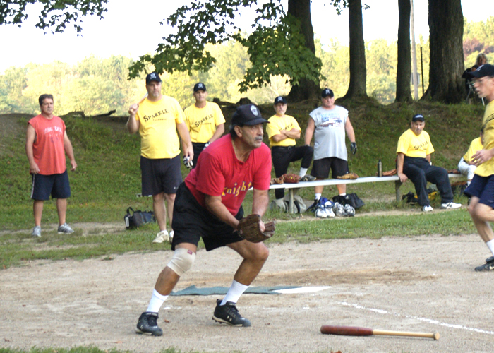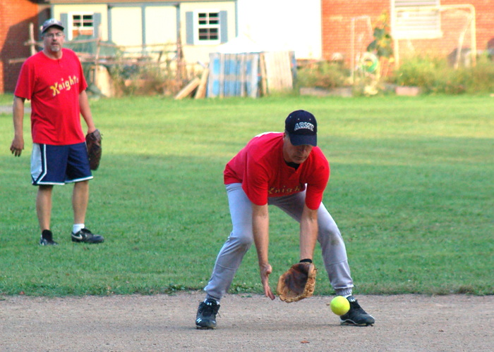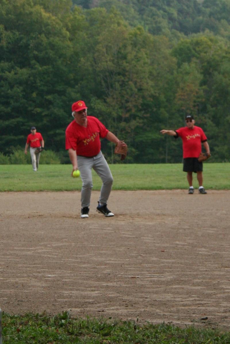 Denny Collins on the hill for Lunetta's with Mike Hallinan pitching for the Knight's below