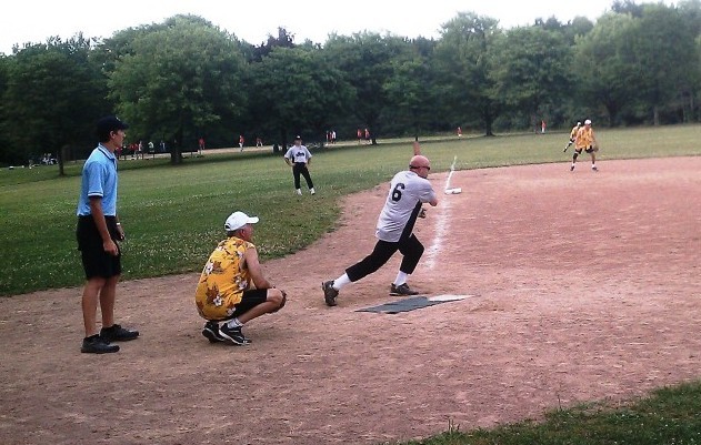 Ken Lorrentz of EA Wireless smacks a ball towards 3rd base in a 7-12-12 contest vs. Sparkle Cleaners. Notice the dry grass after 2 weeks of no drain and temperatures in the high 80's.